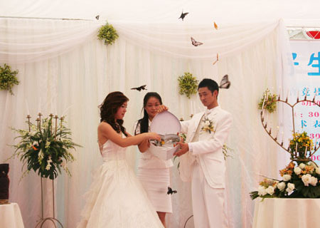 蝴蝶婚禮的儀式為:將蝴蝶裝入一個藤編的筐內(nèi),新人互換婚戒后,共同打開筐子,此時,數(shù)百只絢麗多彩的蝴蝶應(yīng)著歡快的舞曲飛出。全場賓客驚嘆連連。帶著親友們和新人對未來幸福生活的無限憧憬,色彩斑斕的蝴蝶圍繞著著喜宴大廳翩翩起舞,令人驚艷。