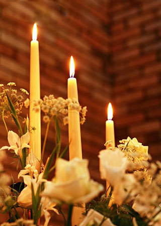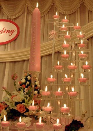 2、婚禮蠟燭也做成婚桌的一個(gè)裝飾,刻以放在桌花上,也可以直接讓花藝師設(shè)計(jì)之后放在婚桌上,當(dāng)婚禮現(xiàn)場(chǎng)燈光逐漸暗淡,新人點(diǎn)燃主套上的蠟燭,所有的婚桌的蠟燭也同時(shí)點(diǎn)燃,婚禮現(xiàn)場(chǎng)同時(shí)閃爍盈盈的燭光,這種氛圍也是非常浪漫的。 3、婚禮蠟燭也可以用在路引上,可以使在高高豎起的路引上放上蠟燭,或者干脆用透明的蠟杯裝上蠟燭,沿著新人入場(chǎng)的紅地毯順序擺放,當(dāng)新人入場(chǎng)時(shí)點(diǎn)燃蠟燭,這種方法也深得新人的青睞。 總之,蠟燭在婚禮中呈現(xiàn)的形式很多,可以從以下幾個(gè)方面配合婚禮的主題,貫穿于婚禮的每個(gè)角落與細(xì)節(jié),自然地與鮮花搭配,從而營(yíng)造出更加完美浪漫的氛圍。 |