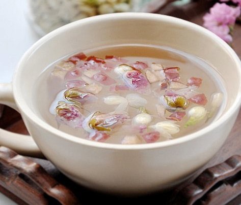 2、將玫瑰,茉莉,棗肉放進(jìn)杯中,倒入少許開水,搖晃搖晃,將水倒出(目的是洗去浮灰),再次沖入足夠量的開水,泡2-3分鐘即可飲用。
