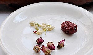 原料:干玫瑰花苞5朵、茉莉花苞6朵、紅棗1顆。