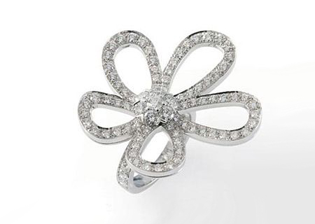 Van Cleef & Arpels Flowerlace花型戒指。Flowerlace系列進一步延續(xù)了Fleurette珠寶系列的柔美與靈動。戒指是附著在手指上的精致曲線,絹絲設(shè)計的吊墜顯露出透視的效果;鉆石組成的絲帶耳環(huán)閃耀而迷人。