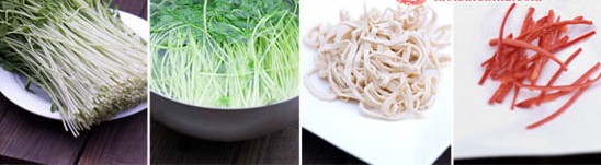 豌豆苗一把、豆腐絲若干、紅椒絲若干、蒜泥一勺、生抽一勺、醋3勺、糖半勺、鹽若干、香油一勺。