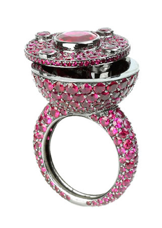 寶詩龍Secret rubis 戒指 設(shè)計靈感源自歐洲王室貴族匿藏私物的戒指。滿鑲紅寶石的戒圈演繹復(fù)古的華麗,頂部可以旋開的活蓋設(shè)計讓它多了一份神秘。在戒指里再藏起一個驚喜送給她,享受一份極致的誘惑
