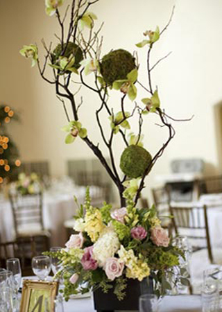 擺脫常規(guī)的桌花設(shè)計框架,將枝干的運用發(fā)揮到極致,整體造型典雅、別致,象征著探春發(fā)芽、生機盎然的美好寓意。