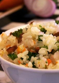 原料: 西蘭花50克,胡蘿卜30克,洋蔥20克,臘肉50克,米飯200克 做法: 1.[材料準備]西蘭花切小朵, 胡蘿卜洋蔥切小丁,臘肉一小塊,隔夜米飯微波下備用 2.起鍋點小火,加適量冷油和胡蘿卜翻炒 3.待油變成胡蘿卜色時放洋蔥和切片的臘肉 4.開大火,放西蘭花和米飯繼續(xù)翻炒 5.加適量的鹽和雞精,關火,炒勻裝盤就好享用啦~