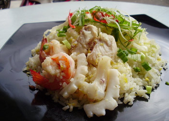 原料: 橄欖油1湯匙,洋蔥1個(gè),切丁,西洋芹2根,切片,青或紅色甜椒1個(gè),去籽,切絲,大蒜2瓣,拍碎,生姜末1茶匙,紅辣椒粉1/2茶匙,中等辣度的辣椒粉1茶匙,長(zhǎng)粒米215克,熱蔬菜湯或低脂低鈉雞湯480毫升,西紅柿丁1罐,荷蘭芹3湯匙,切碎,大生蝦225克,去殼,去腸,去皮鮭魚排225克,切丁,鹽和胡椒少許 做法: 1.鍋置中火上,下油加熱。放入洋蔥,炒3分鐘。加入西洋芹、甜椒、大蒜、生姜、紅辣椒粉、辣椒粉和米,炒2分鐘。 2.倒入熱湯,攪勻,轉(zhuǎn)小火,加密封蓋,燜15分鐘。 3.一邊攪拌一邊加入西紅柿及西紅柿汁、2湯匙荷蘭芹、蝦和鮭魚。加蓋,燜3至4分鐘,至海鮮熟透,米飯將大部分湯汁吸收并變軟。 4.用鹽和胡椒調(diào)味,撒上剩余的1湯匙荷蘭芹,趁熱食用。 |