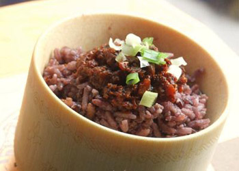 原料: 黑糯米150克、白糯米200克、紅豆沙餡150克、蜜棗10顆、蓮子20粒、腰果10粒、葡萄干50顆、小紅棗20顆、豬油20克、白糖10克。 做法: 1、將紅棗蓮子腰果提前1天泡上。泡發(fā)好; 2、將黑白米洗干凈,加水超出米面1.5CM高左右,喜歡干的可少加點(diǎn),入電飯煲煮成米飯備用; 3、將米飯中趁熱拌入白砂糖和豬油,攪拌均勻; 4、取一圓底碗,將蜜棗,蓮子,腰果,葡萄干,小紅棗整齊的鋪在碗底,然后帶上一次性手套,抓一大把飯按壓在上面,同時(shí)按壓到碗壁四周,如圖; 5、取豆沙餡按入中間的凹陷處,再取適量的米飯蓋住豆沙餡,用力按壓平整; 6、將做好的八寶飯入蒸鍋,用中小火蒸50分鐘即可。 泰式酸辣炒飯