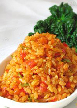 原料: 雞肉丁1兩,蝦仁1/2兩,新鮮干貝1/2兩,鳳梨丁1兩,蘆筍丁1/4兩,蛋1個(gè),白飯6兩,肉松1兩,碎果仁1兩,太白粉適量,鹽適量,鮮雞晶適量 做法: 1. 將雞肉丁與調(diào)味料A攪拌均勻腌入味備用;蛋打散成蛋液備用。 2. 熱油鍋,將作法1的雞肉丁及蝦仁、新鮮干貝以大火快炒過油后撈起瀝干備用。 3. 熱油鍋,將蛋液與白飯一起下鍋炒至米粒呈松散狀時(shí),將作法2的材料、鳳梨及調(diào)味料B下鍋炒勻入味即可盛入餐盤中,再撒上肉松及碎果仁即可食用。 |