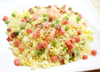 原料: 豬絞肉20公克,雞蛋2顆,洋蔥20公克,青豆仁10公克,白飯1碗,沙拉油10㏄,咖哩粉20公克,鹽適量,白胡椒粉適量 做法: 1.熱鍋,加入沙拉油(份量外),輕輕搖動(dòng)鍋?zhàn)邮贡砻娑几采w上薄薄一層沙拉油后,倒除多余沙拉油,接著再重新倒入10㏄的沙拉油。 2.將作法1的鍋?zhàn)娱_大火,待油溫至約80℃時(shí),加入洋蔥碎、豬絞肉炒香,炒至豬絞肉出油,再加入蛋液快炒至略收干有香味,續(xù)加入咖哩粉和白飯快速拌炒。 3.待作法2中白飯炒散后,加入青豆仁炒熟,最后加入鹽、白胡椒粉拌炒均勻調(diào)味即可。 揚(yáng)州炒飯