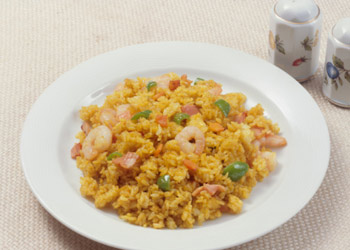 原料: 米飯250克,火腿腸30克,雞蛋1個(gè),豌豆20克,黃瓜20克,蝦仁25克,新鮮玉米粒20克,色拉油1勺,味精適量,蔥花1適量,精鹽1勺 做法: 1.豌豆、黃瓜、蝦仁洗凈;鹜饶c、黃瓜、蝦仁都切成小丁。 2.雞蛋打散,放入油鍋中炒熟,切碎。 3.鍋中放適量油,開大火燒熱,加入蔥花、火腿、豌豆、蝦仁、黃瓜丁、玉米粒,翻炒至熟。 4.加入米飯和炒好的雞蛋,撒上味精、鹽,迅速翻炒均勻,即可盛盤。 |
