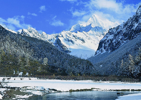亞丁風(fēng)景區(qū)在稻城縣境內(nèi),這里最懾人心魄的是三座巍然矗立的雪峰,這三座神山分別是仙乃日、央邁勇和夏諾多吉,能一次完整清晰地看到它們的真面目,實在是此行同伴們的運氣。仙乃日(意為觀世音菩薩)海拔6032米,是稻城縣第一高峰,看似觀世音菩薩坐于蓮花臺上,手持寶瓶乘祥云而來,慈目注視腳下人間仙境。央邁勇(意為文殊菩薩)海拔5958米,晶瑩剔透,潔白無瑕,宛若一位端莊嫻靜、冰清玉潔的少女。夏諾多吉(意為金剛菩薩)海拔5958米,就如同一位英俊剛烈、神采奕奕的少年。在藍(lán)天白云的簇?fù)硐,三座神山顯得威嚴(yán)神圣,高高在上不食人間煙火,它們或許是我們這個藍(lán)色星球上最后的凈土了。 |