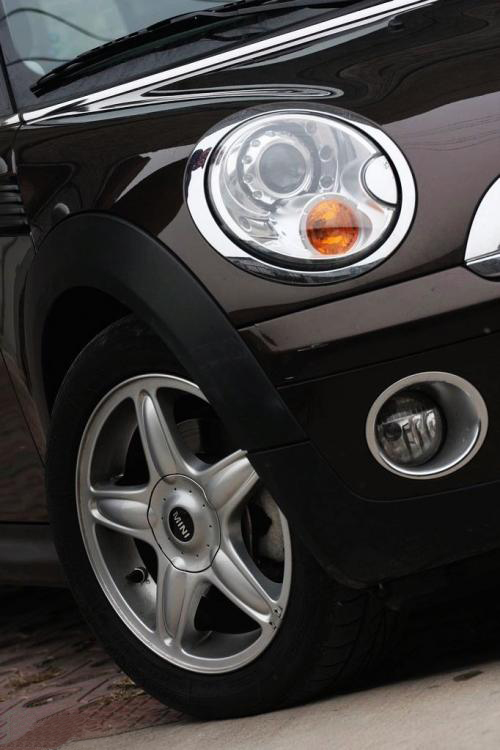靚麗時尚的外形是展現(xiàn)個性的基礎(chǔ) 試駕車使用了巧克力色的車身噴漆,想必那些追求浪漫的消費者第一眼就會喜歡上它,銀灰色的車頂與車身顏色形成對比,突出了該車獨特的個性。圓圓的頭燈和霧燈看似普通,但是由鍍鉻材料裝飾后,卻顯得異常精致,被前保險杠分開的進氣格柵同樣由鍍鉻飾條裝飾,看上去好像日本動畫片中某個人物的大嘴,看著有些憨厚平常,但放在MINI的前部卻為該車增添了不少討人喜愛的元素。該車的前后保險杠下沿、輪拱以及側(cè)面車身底梁都使用了暗灰色的面板材料,不但增強了該車的運動氣息,而且在車輛行駛于不良路況時也有助于保護車身。該車的一個創(chuàng)新設(shè)計在于采用了5門式造型,不但后備箱的車門是對開的,而且副駕駛車門與其后方延伸出的小門也是對開的,非常實用。
