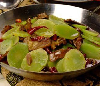 原料: 板鴨一只,萵筍半斤切片,干辣椒節(jié)10克,鹽2克,味精2克,醬油2克,蒸魚豉油5克,四川豆瓣醬20克,鮮湯300克,姜末5克,茶油15克。 做法: 1.板鴨入籠中大火蒸1小時至透,取出放涼,切長5厘米、寬3厘米的條,入沸水中大火汆1分鐘,撈出控水。 2.萵筍去皮洗凈,斜刀切厚0.2厘米的片。 3.鍋入茶油,燒至七成熱時放入干椒節(jié)、四川豆瓣醬、姜末小火煸香,放入萵筍片、板鴨條小火翻炒2分鐘,入鮮湯小火燒5分鐘,加鹽、味精、醬油、蒸魚豉油調(diào)味后出鍋,放入干鍋內(nèi)上桌即可。 |