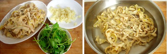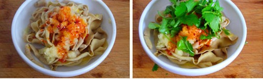 嘮叨: 1、做蒜泥類菜肴,最好不放生抽,因為生抽會搶了蒜泥的味道; 2、燙鴨腸的時候一定要快,水燒開后放入,2-3分鐘待水開后即可; 3、撈起來的鴨腸放入涼水里冷卻,口感更爽脆; 4、香菜一定不能少,還可以加入榨菜丁一起拌勻。 |