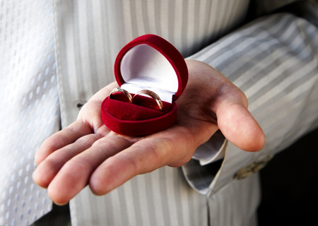 三. 保管結(jié)婚戒指 你知道前一天,新郎必然大醉,所以為了避免現(xiàn)場(chǎng)忙做一團(tuán),保管工作按照慣例又交給了伴郎。作為筆者就曾一次失手放在了洗手間,好在及時(shí)找回,有驚無險(xiǎn)。所以建議放在保險(xiǎn)柜,第二天早起去取,之后一直放在西服口袋里,直到婚禮舉行。
