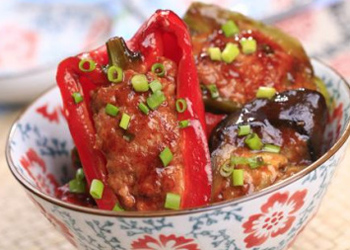 賣五元三件任配搭的“煎釀三寶”是香港極受歡迎的街頭小食之一,“煎釀三寶”就是在一堆的魚丸、釀青椒、茄子、豆腐等食物中任選三款,自由配搭,是街頭小食必吃之選。 原料: 鯪魚肉250克,馬蹄2粒,蝦米1湯匙,青椒 2個,茄子1條,豆腐一磚。 做法: 1、蝦米浸軟切碎粒,馬蹄切碎粒。 鯪魚肉剁碎及攪至起膠,再拌入蝦米粒和馬蹄粒,并以鹽、糖各1/8茶匙,生抽1/2茶匙,胡椒粉少許,水1茶匙調味。 2、將青椒、茄子和豆腐切件,并把魚膠嵌進。 3、用高火煮滾油,把嵌滿魚肉的青椒、茄子和豆腐炸約5分鐘至金黃色即可。 |