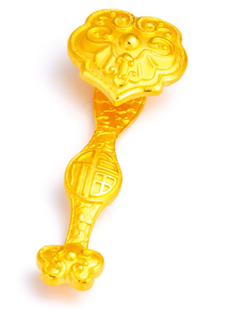如意:取材于傳統(tǒng)婚禮儀式中用于新郎掀開(kāi)新娘紅蓋頭的如意秤,現(xiàn)作為父母送給出嫁女兒的婚慶之寶,希望女兒今后的生活稱(chēng)心如意,夫妻如意同心。