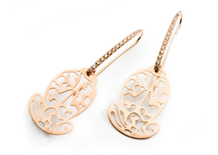 精致的葉狀回紋造型為耳墜點(diǎn)睛之筆,絕妙搭配密鑲褐鉆的長型耳鉤。同款項(xiàng)鏈則由環(huán)形鏈扣與五枚葉狀回紋造型吊墜串聯(lián)而成。
