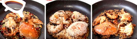 原材: 大肉蟹一只(最好不少于一斤半)、蔥段、姜末、蒜蓉50克(多一些比較香)、干辣椒10個(gè)、面包糠、淀粉、豆豉、生抽、黃酒、白糖。 做法: 1-2、先用20毫升白酒從蟹嘴中灌入,等蟹醉后將其身體刷干凈,斬件分成5部分。 3、將斬件的蟹用白酒略微腌制一下,全部拍上淀粉備用。 4、蒜蓉,姜末,蔥末,豆豉先用油浸泡一天備用, 5、起油鍋,油可以多倒一些,8成熱時(shí),放入蟹肉,蒜蓉炸香后撈起。 6、鍋內(nèi)留一些余油,將泡制一天的4中佐料倒入鍋中,放入干辣椒碎一起炒香。 7、接著放入炸香的螃蟹,倒入生抽,一勺白糖,黃酒,繼續(xù)伴炒入味。 8、看到蒜蓉都炒成焦黃色時(shí),倒入部分面包糠增加色澤, 9、等面包糠與佐料全部融合入味時(shí),即可撈起盛盤。
