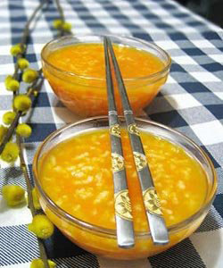 A:南瓜粥 材料:小南瓜1個、糯米粉適量、冰糖適量。 做法:南瓜洗凈,去皮去瓤,切成大塊。將南瓜塊放入微波爐專用的蒸盤中,在蒸盤下層加入適量水,上面蓋上蓋子,放入微波爐中高火加熱10分鐘左右。蒸好的南瓜取出,用筷子或叉子試一下看南瓜是否已經(jīng)蒸透,然后放入容器,趁熱用小勺壓成南瓜泥。南瓜泥放入湯鍋,加入清水煮開,清水與南瓜泥的比例為2比1。待水煮開的時候,取來一個小碗,將糯米粉用水調(diào)成糊狀。待南瓜泥煮開后,用湯勺舀一勺糯米糊加入湯鍋中,并不斷攪拌以防止糯米糊結(jié)塊。稍煮一會后加入冰糖或白糖調(diào)味即可。