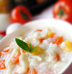 B:胡蘿卜蛤蜊粥 材料:粥底1鍋、蛤蜊肉100克、胡蘿卜1根、姜絲5克、蘆筍50克。 做法:粥底煮開,加入胡蘿卜煮10分鐘;加入泡好的蛤蜊肉、姜絲繼續(xù)煮15分鐘;蘆筍過熱水切丁用少量鹽拌一下,搭配胡蘿卜蛤蜊粥一起吃吧。