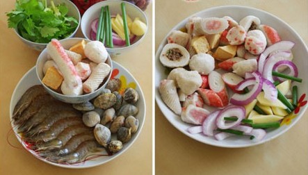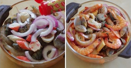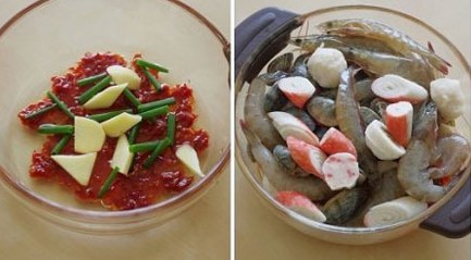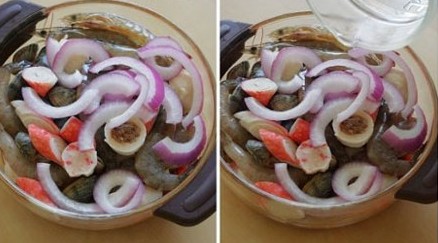 3、充分?jǐn)噭蚝,加入姜片和蔥段; 4、加入蝦、蛤及各式魚(yú)丸、蟹棒; 5、表面撒上切好的洋蔥絲; 6、加水,至全部食材的1/3處;