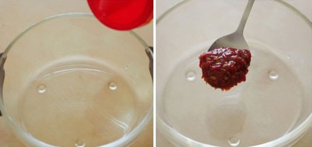 做法: 1、容器中加入少許油; 2、加入兩大勺辣椒醬;