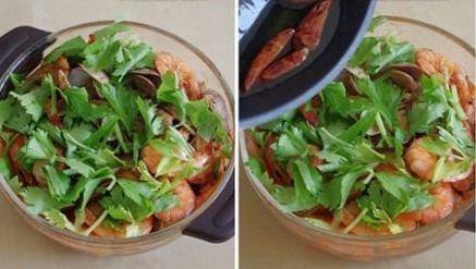7、加入一大勺海鮮醬油,翻拌均勻,送入微波爐,高火加熱8分鐘; 8、取出上下翻拌均勻,再次放入微波爐,高火加熱8分鐘; 9、將新鮮的香芹葉撒在表面,送入微波爐,高火加熱3分鐘左右; 10、另起鍋,用干辣椒榨油,趁熱澆在海鮮鍋中,拌勻即可。