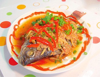 材料:羅非魚(1尾)、榨菜(50克)、豬絞肉(50克)、紅椒(1只)、蔥(2根)、姜(5片) 調(diào)料:油(1湯匙)、料酒(1湯匙)、蠔油(1湯匙)、蒸魚醬油(2湯匙)、白糖(1/3湯匙)、香油(1/3湯匙) 做法: 1、羅非魚洗凈,在魚背處橫切一刀,抹上一層鹽,腌制5分鐘;姜切成細絲,蔥切成蔥花,紅椒切成細絲。 2、榨菜切成細絲,與豬絞肉一起放入碗內(nèi),加入1湯匙油、1湯匙料酒、1湯匙蠔油、2湯匙蒸魚醬油和1/3湯匙白糖拌勻,腌制15分鐘入味。 3、往羅非魚腹中塞入少許姜絲,魚身也灑上姜絲,將腌好的肉末榨菜絲鋪在魚身上,腌制15分鐘入味。 4、待灑上一層紅椒絲后,再給羅非魚蓋上一層保鮮膜。 5、燒開鍋內(nèi)的水,放入羅非魚大火隔水清蒸15分鐘,取出灑上蔥花,淋上1/3湯匙香油即可。 剁椒蒸魚