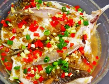 原料:鮮魚一條,剁椒,蔥花,姜末。 做法: 1、將魚去鱗,去內(nèi)臟清洗干凈。 2、將魚頭魚尾切下,魚身切細刀,魚肚子項鏈,魚頭中間切一小刀,用刀背拍扁整形。魚尾中間略微去骨整形。 3、將盤底放上姜片,切好的魚擺盤好。 4、蔥花,姜末切好,剁椒剁碎。 5、將魚身略微抹上鹽,料酒,然后撒上剁椒、姜末。 7、拿出后撒上蔥花,澆一層熱油即可。 |