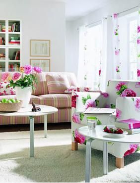 淡綠色花朵圖案窗簾+綠色條紋沙發(fā)椅,充足柔和的陽光,鮮花綻放的靠枕,以及插花點綴,營造出春天田園的自然氛圍。