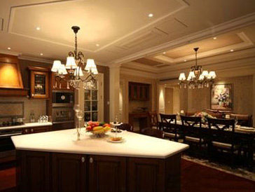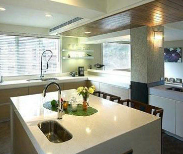 廚房這個寸土寸金的小空間,須要高效地利用每個角落。中島櫥柜不僅可以用作料理臺、餐柜、吧臺、餐桌,還可以充當(dāng)開放式廚房與客廳的隔板。中島櫥柜可供多人同時使用,是一個聯(lián)絡(luò)家人、朋友感情的區(qū)域。但是中島櫥柜的設(shè)計須要配合整個廚房的規(guī)劃,要注意尺寸比例和通道配置,這樣才能使中島廚房兼具美觀和實用性。 案例一:小戶型中島廚房 中島廚房1 這個開放式廚房的設(shè)計可供很多小戶型家庭參考。屋主將電視墻移至餐廳區(qū),滿足用餐結(jié)合視聽的需求。中島成為廚房與餐廳自然隔板。另外一處亮點就是餐桌上方的天花板與電視背景墻采用了黑色鏡面材質(zhì),讓視覺高度、廣度得以延伸,使用餐空間更加開闊。 中島廚房2 這個中島櫥柜的設(shè)計非常高效得利用了空間。中島的一面水槽料理臺與灶臺相對,非常方便烹飪;中島的另一面則可用于就餐使用。對于小戶型廚房來說,中島的作用可以集料理臺、櫥柜、餐桌為一體。 案例二:中戶型中島廚房 中島廚房3 明亮開放式的中島廚房設(shè)計,由于廚房面積夠大,方形的中島一邊安裝了一個水槽變成料理臺,另一面則放置了兩把椅子形成簡易的餐臺。這樣讓本區(qū)也成為了家人生活另一處聚集的重心所在。 中島廚房4 這個深色的實木櫥柜搭配了白色的大理石臺面,加上富有歐式復(fù)古的吊燈做裝飾,整個廚房盡顯歐式情調(diào)。該櫥柜的中島根據(jù)廚房的形狀設(shè)計成了不規(guī)則形狀。下面可以作為餐柜,上面則是一張簡易的餐桌。 |