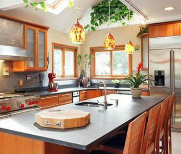 中島廚房7 開(kāi)放式廚房的島型櫥柜,整合了廚房、餐廳的空間,節(jié)省下購(gòu)買櫥柜、吧臺(tái)、餐桌的花費(fèi)和占用的空間。任何形式的櫥柜加上一座離桌就是島型櫥柜,島型櫥柜可當(dāng)工作桌作備料使用,或者在島臺(tái)上安裝水槽。島型櫥柜最好配合開(kāi)放式廚房設(shè)計(jì),并且需與其他櫥柜保留80~100厘米以上的走道距離。 中島廚房8 中島廚房最大的優(yōu)勢(shì)在于與餐廳之間的開(kāi)放格局,使廚房開(kāi)闊明亮。對(duì)于家庭主婦來(lái)說(shuō),中島廚房等于增加了使用面積,中島櫥柜結(jié)合水槽、切菜區(qū)后,可以在原處擺放一些廚房電器,非常實(shí)用。很多人以為島型廚房是別墅和大戶型的專利,其實(shí)小戶型設(shè)置島臺(tái)更符合空間效益,因?yàn)閸u臺(tái)可以代替餐桌、料理臺(tái),很大程度上增加了空間使用率。 |
