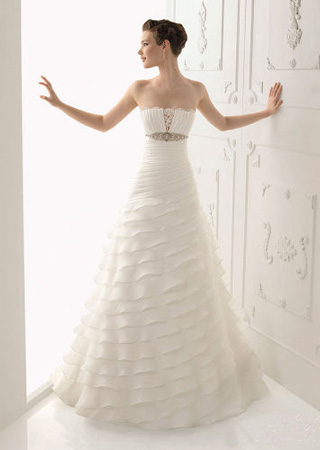上圍的豎褶和下擺的一環(huán)環(huán)裙邊形成對比。