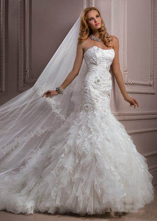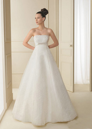 下擺條紋狀的面料肌理,讓純白婚紗不單調(diào)。