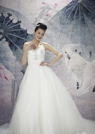 公主白緞裙身,裙身覆以多層進(jìn)口網(wǎng)紗。胸線與腰身處手工鑲釘進(jìn)口水鉆,圖案別致迷人。紗質(zhì)婚紗中罕有中長拖尾,可擔(dān)主紗重任,朦朧美好猶如潔白天鵝。