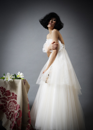 層疊白紗與淺杏色花朵,精美刺繡工藝。蓬松多層米白紗裙擺,仿佛宮殿花園云朵上一場(chǎng)午后之夢(mèng)。