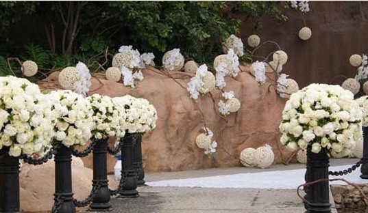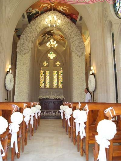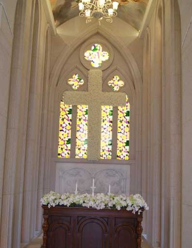 教堂里的花就更漂亮了,7米高的花門,2米高的十字架,圓球,花環(huán)都襯托出婚禮的莊嚴(yán)和圣潔