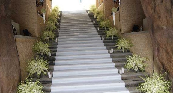 臺階上有蠟燭,用泰國蘭花插成放射花藝。