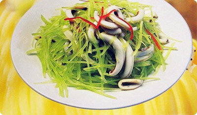 主料:萵筍150克。輔料魷魚75克,紅椒適量。調(diào)料精鹽5克,味精5克,花椒油10克。 做法: 1、把魷魚清冼干凈,用刀切成絲,水鍋上火,燒沸后將魷魚絲略氽撈出。萵筍去皮洗凈切成絲,紅椒切絲待用。 2、取小碗一只,加入精鹽、味精、花椒油拌勻后和萵筍絲、魷魚絲、紅椒絲拌勻即可裝盤上桌。 干鍋板鴨煮萵筍