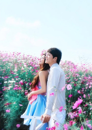 如果覺得加入一些彩色的元素來點綴婚紗照過于做作,不妨到一個花卉園里或者一片浪漫的花海里來拍攝。真實的效果不用說,聞著陣陣撲鼻而來的花香也會讓人的拍攝心情非常好,拍出最完美的婚紗照。