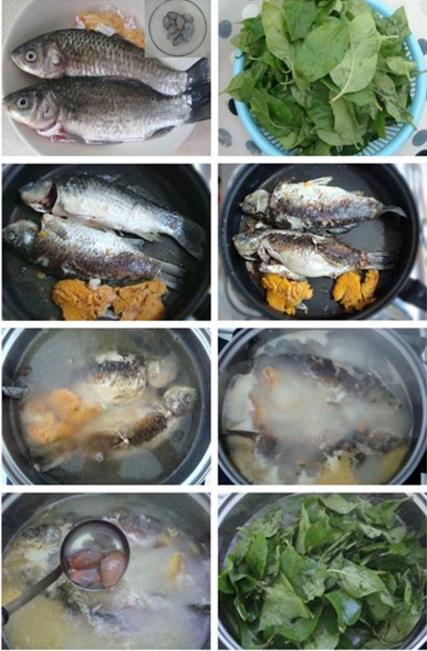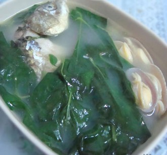 枸杞葉為"天精草",具有養(yǎng)陰補(bǔ)血、滋補(bǔ)肝腎、清熱止渴,益精明目功效,F(xiàn)代藥理學(xué)研究表明:長期食用枸杞菜,有延緩衰老、增強(qiáng)免疫力等作用。 鯽魚亦有利水消腫、益氣健脾、清熱解毒的作用。 原料: 鯽魚、枸杞葉、花蛤。 做法: 1、鯽魚、枸杞葉洗凈,控干水分,鍋下油,慢火把鯽魚煎至微黃(這季節(jié)的鯽魚比較多魚籽,煎過的魚籽,熬的湯會(huì)比較香); 2、加入熱水(這次我試了用熱水,據(jù)說熬出的湯顏色更白,試了后感覺和冷水差不多),把姜絲放入,大火熬成白色,煲沸后改小火繼續(xù)熬十分鐘; 3、先后放入花蛤和枸杞葉,熟后放鹽即可。