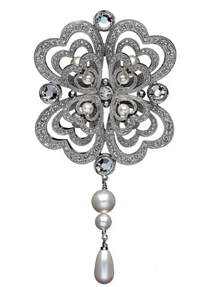 珍珠胸針 這款珍珠胸針由四部分桃心形狀鑲上小粒的鉆石而組成,由小粒鉆石鑲嵌而成的眾多小桃心呈不規(guī)則的形狀分布,尾部的珍珠呈水滴形狀,珍珠的圓潤在繁復(fù)的鉑金外圍的點(diǎn)綴下顯得更加的優(yōu)雅。這款胸針若是搭配白色的禮服能讓新娘顯得氣質(zhì)迷人。