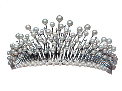這款珍珠皇冠適合在婚禮當(dāng)天將頭發(fā)挽起的新娘,戴上這款珍珠皇冠將讓新娘擁有如公主般的感覺,也將新娘襯托的如女神般的光彩照人,眾多的珍珠呈半圓形的形狀分布,為新娘的頭發(fā)增加光彩。