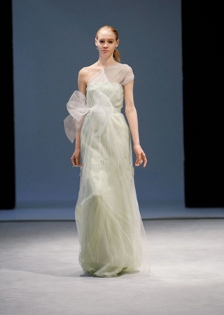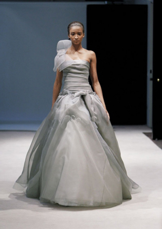 銀灰色婚紗并不多見,成為VERA WANG今季婚紗設(shè)計(jì)的亮點(diǎn)。這款婚紗雖然采用經(jīng)典的A字廓形,但肩頭的薄紗蝴蝶結(jié)令它頓生風(fēng)姿。