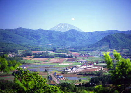 北海道赤井川村:清流余市河和雄偉自然的度假村綠色的大地上,牛群在悠閑地食草。