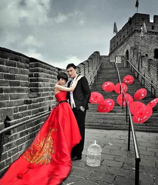 浪漫的婚紗照片,新郎和新娘兩個(gè)人一起,兩個(gè)新人的手都交叉放在背的后面,幸福的味道在不經(jīng)意間就慢慢的流露出來,新郎的禮服是極其簡單款的設(shè)計(jì),將新娘和新郎的浪漫都表現(xiàn)出來了。