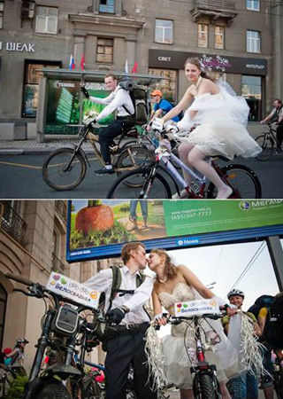 全美賽車聯(lián)合會戴托那500英里賽道上喜結(jié)連理的夫妻 不一定非要你是小戴爾恩哈特才能在賽道上找到真愛。去年情人節(jié)當(dāng)天,31對全美賽車聯(lián)合會的夫妻在戴托那國際賽道喜結(jié)連理。成千上萬的追捧者、朋友及家人在看臺上注視著他們。布萊恩威利和肯尼迪兩個甚至交換具納斯卡風(fēng)格的紋身戒指。賽道也提供個人婚禮套餐,包括饒賽道游行兩圈、一瓶香檳和一個公證人,也可選擇在可以俯瞰著名賽道的一個房間舉辦婚宴。 一對俄羅斯戀人決定騎自行車結(jié)婚 一對熱愛騎行的戀人決定用一種不尋常而又健康的方式結(jié)婚,那就繞整個城市騎行,當(dāng)然同行的還有他們騎著車的客人。 |