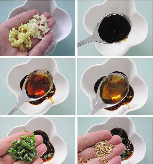 調(diào)蘸汁:小碗或者碟子里放入蒜泥和生姜碎,加入醬油,紅油(是我自己添加的),麻油,蔥和白芝麻(也是我自己添加的)
