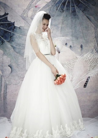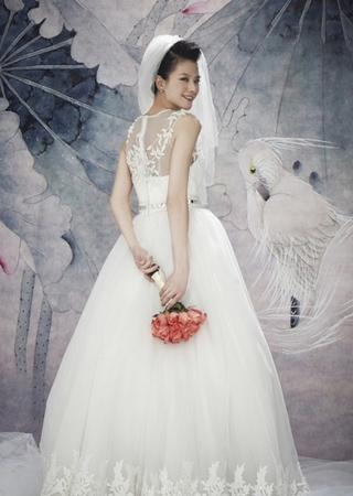 公主白緞裙身,上半身覆以進(jìn)口網(wǎng)紗,歐根紗襯蕾絲裙身。上半身與裙擺處手工鑲釘象牙色白緞花葉圖案,優(yōu)雅含蓄,宛如清新香草。圖案與腰線處手工鑲釘進(jìn)口珍珠與方形水鉆。